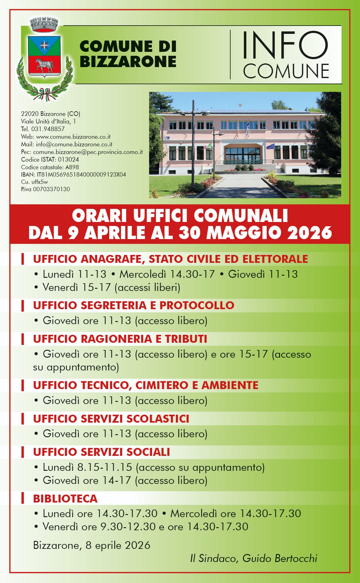 Orari apertura al pubblico Uffici Comunali